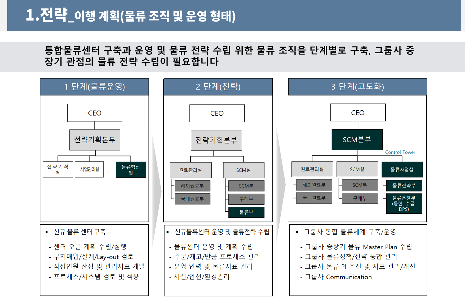 - 전략과 실행을 통제할 수 있는 통합 물류 조직을 구성하여 업무 효율 및 생산성 제고